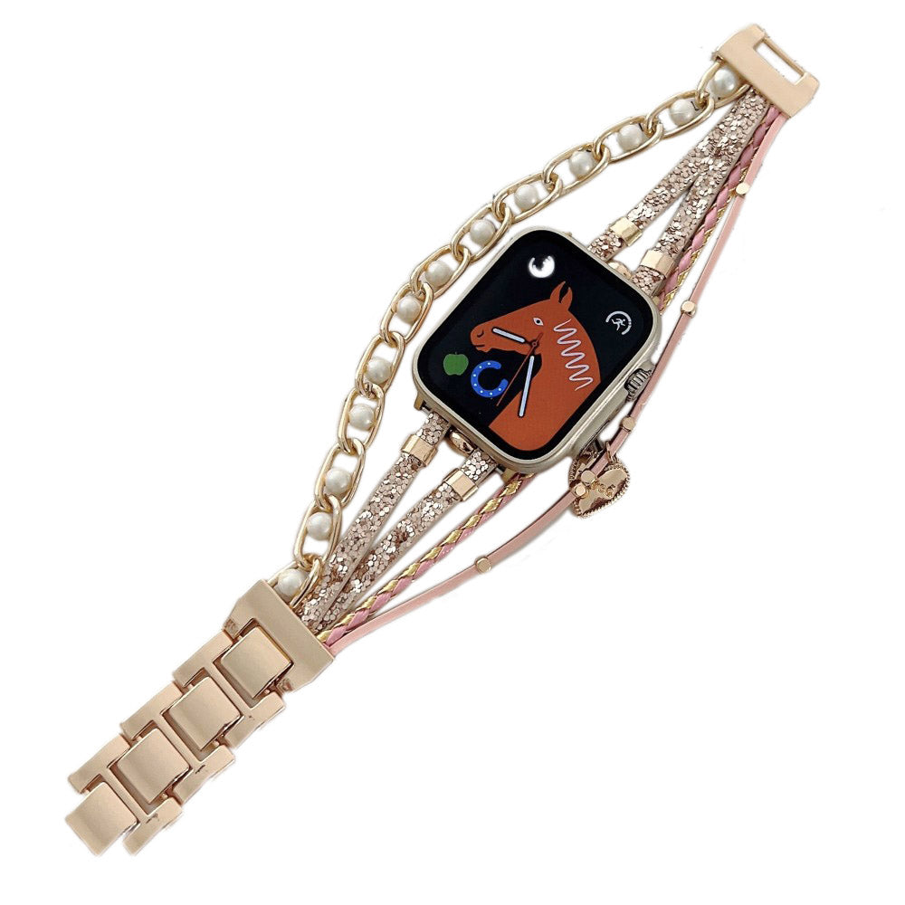 Apple Watch Series (45 mm) / Watch Ultra de metal con correa de piel decorada con flores - Oro