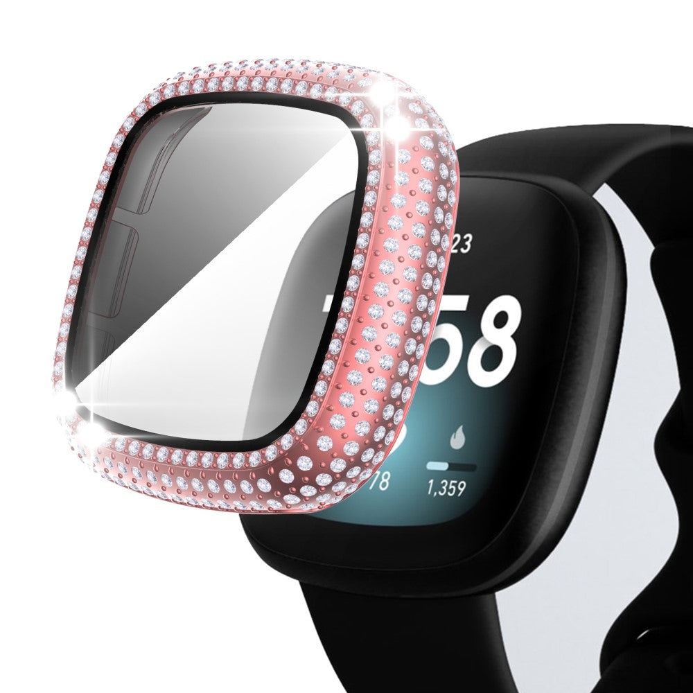 Elegante funda con decoración de strass y cristal templado para Fitbit Sense / Versa 3 - Rosa