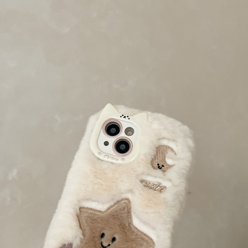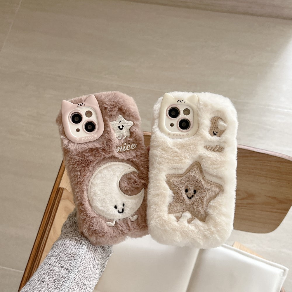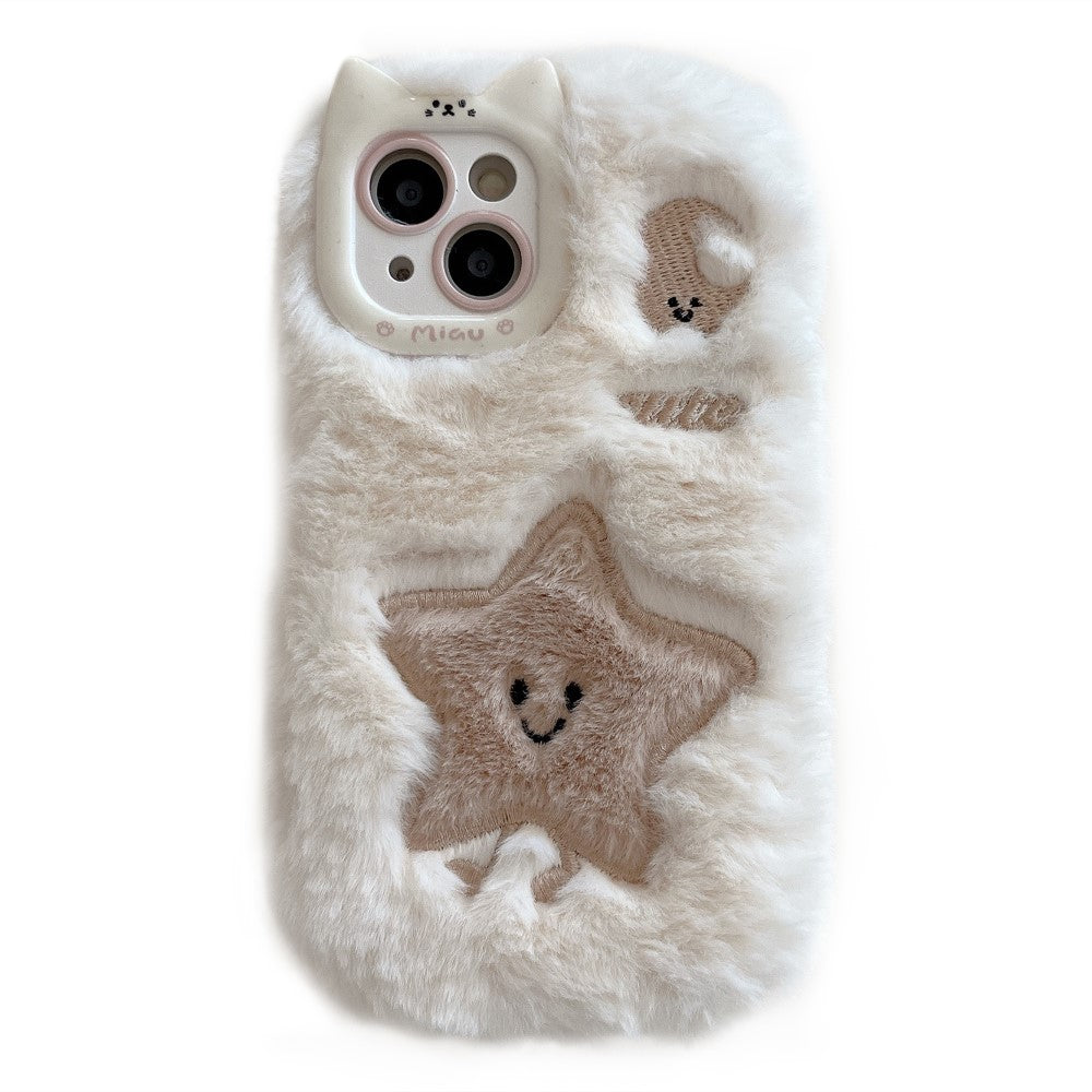 Funda iPhone 15 Bordado Estrella Luna Cálida Felpa Flexible Funda Teléfono - Blanco